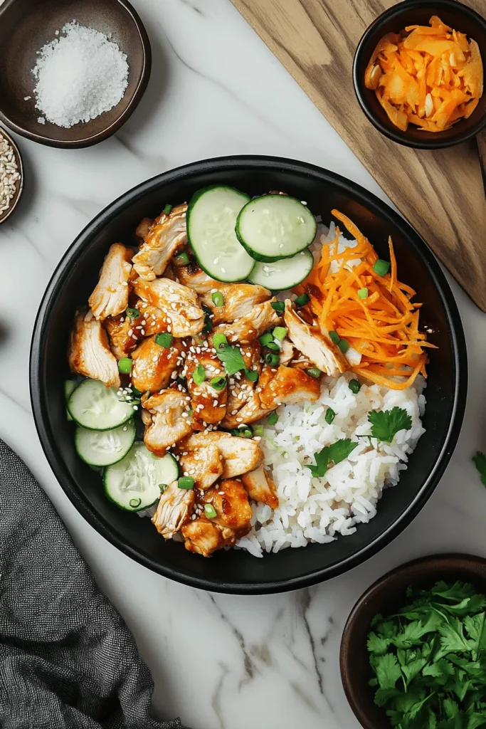 Presenting these Korean Chicken Rice Bowls is all about showcasing the vibrant colors and contrasting textures that make this dish such a crowd-pleaser. Whether you’re serving a casual family dinner or hosting friends for a laid-back weekend lunch, these bowls are as much fun to look at as they are to eat. The trick is to balance each component—rice, chicken, veggies, and garnishes—so the plate feels abundant, yet everything sits harmoniously together. Pay attention to the visual appeal by alternating bright cucumber greens with carrot orange, and sprinkle those sesame seeds just before serving so they gleam.