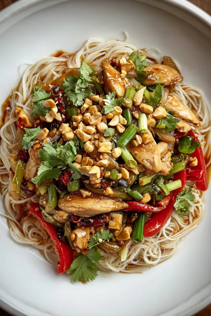 Kung Pao Chicken Noodles is an absolute game-changer when it comes to weeknight dinners or leisurely weekend lunches. This dish bursts with a kaleidoscope of colors—from the ruby-red bell peppers to the vibrant green onions—making every plate feel like a celebration. The tender chicken breast, thinly sliced and stir-fried to golden perfection, pairs flawlessly with silky rice noodles that soak up just the right amount of sauce. Speaking of sauce, the harmonious blend of soy sauce, hoisin, rice vinegar, sesame oil, and a hint of sugar creates that signature balance of salty, sweet, and tangy flavors. Yet it’s the crushed Szechuan peppercorns and red pepper flakes that bring a gentle heat and that quintessential tingling sensation on your tongue, whisking you away to the heart of Sichuan cuisine. With each bite, you’ll experience layers of texture: crunchy peanuts, crisp veggies, and perfectly cooked chicken and noodles all in an outrageously flavorful sauce.