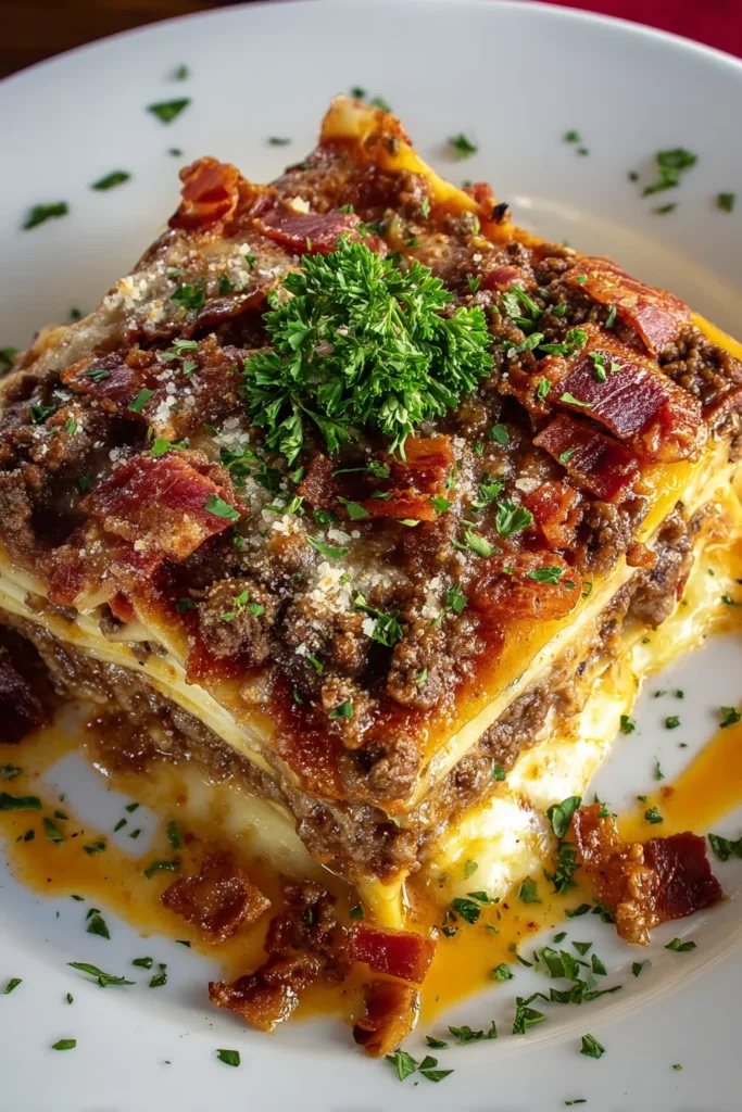 Creating Lasagna Meets Cheeseburger Parmesan Garlic Bacon Style is more than just following a recipe; it’s embracing the fun of combining favorite comfort foods into a single, unforgettable dish. We’ve covered everything from prepping the beef and bacon to layering cheeses and noodles, then baking until golden and bubbly. You’ve also seen how to pair this hearty casserole with fresh salads, roasted garlic bread, and your favorite chilled beverage for a balanced meal. Whether you’re treating family, impressing friends at a potluck, or simply craving a kitchen experiment, this recipe brings high-flavor satisfaction that’s sure to become a new classic in your rotation. Feel free to print this article and save it for later—you’ll want to revisit these instructions whenever the mood for indulgent comfort strikes. Don’t forget, you can also find a FAQ below to troubleshoot any cooking questions or fine-tune details.