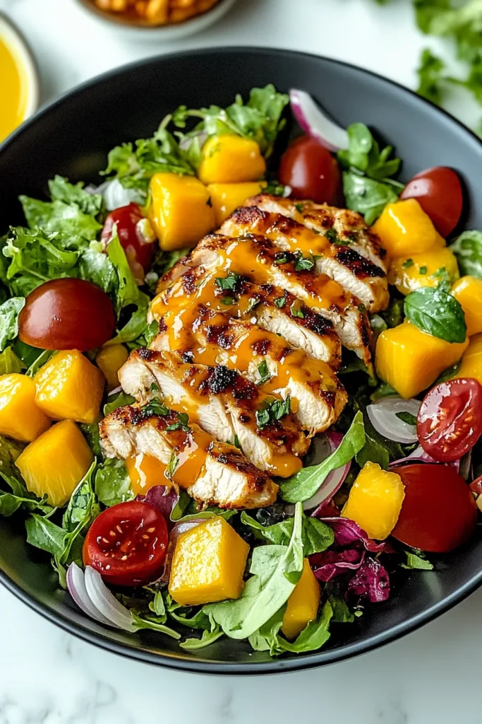 Crisp greens meet juicy mango slices and tender chicken in this vibrant salad. Topped with a tangy, homemade dressing that perfectly balances sweetness and zest, it’s a refreshing and satisfying dish bursting with flavor in every bite.