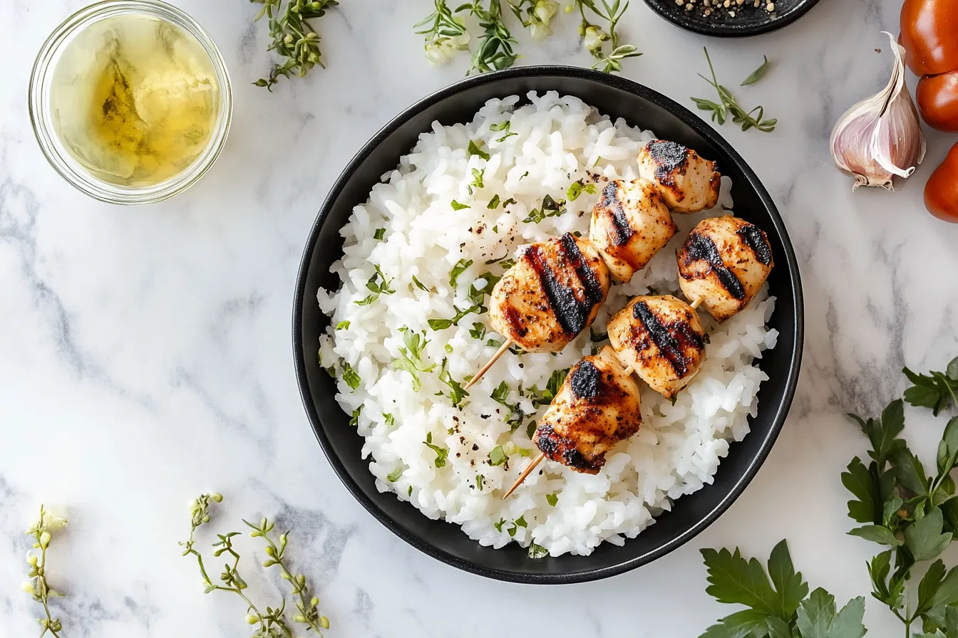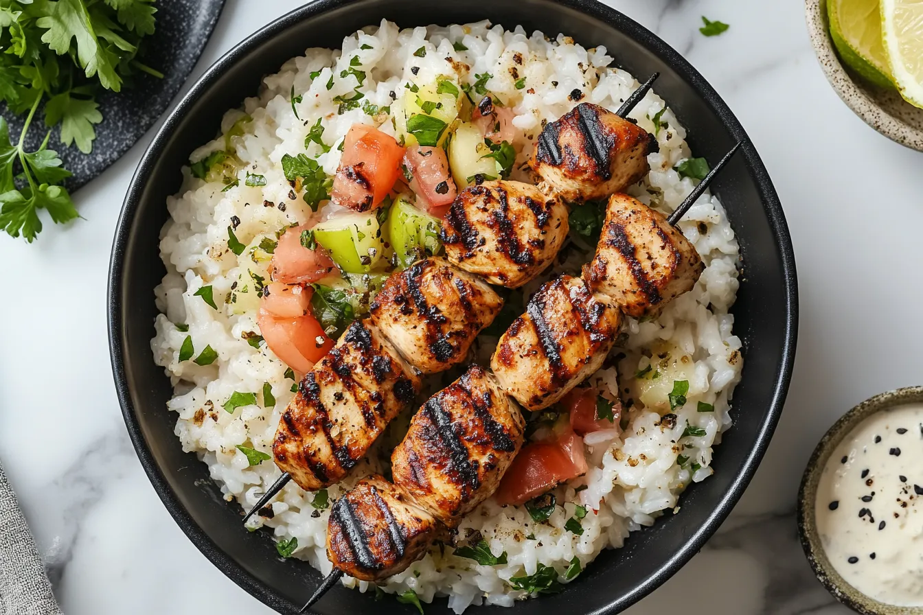 A vibrant Mediterranean Rice Bowl topped with juicy Grilled Chicken Tawook Skewers. Fragrant basmati rice, fresh veggies, and a tangy yogurt dressing bring the perfect balance of flavors. Tender, smoky chicken adds a delicious touch to every bite!
