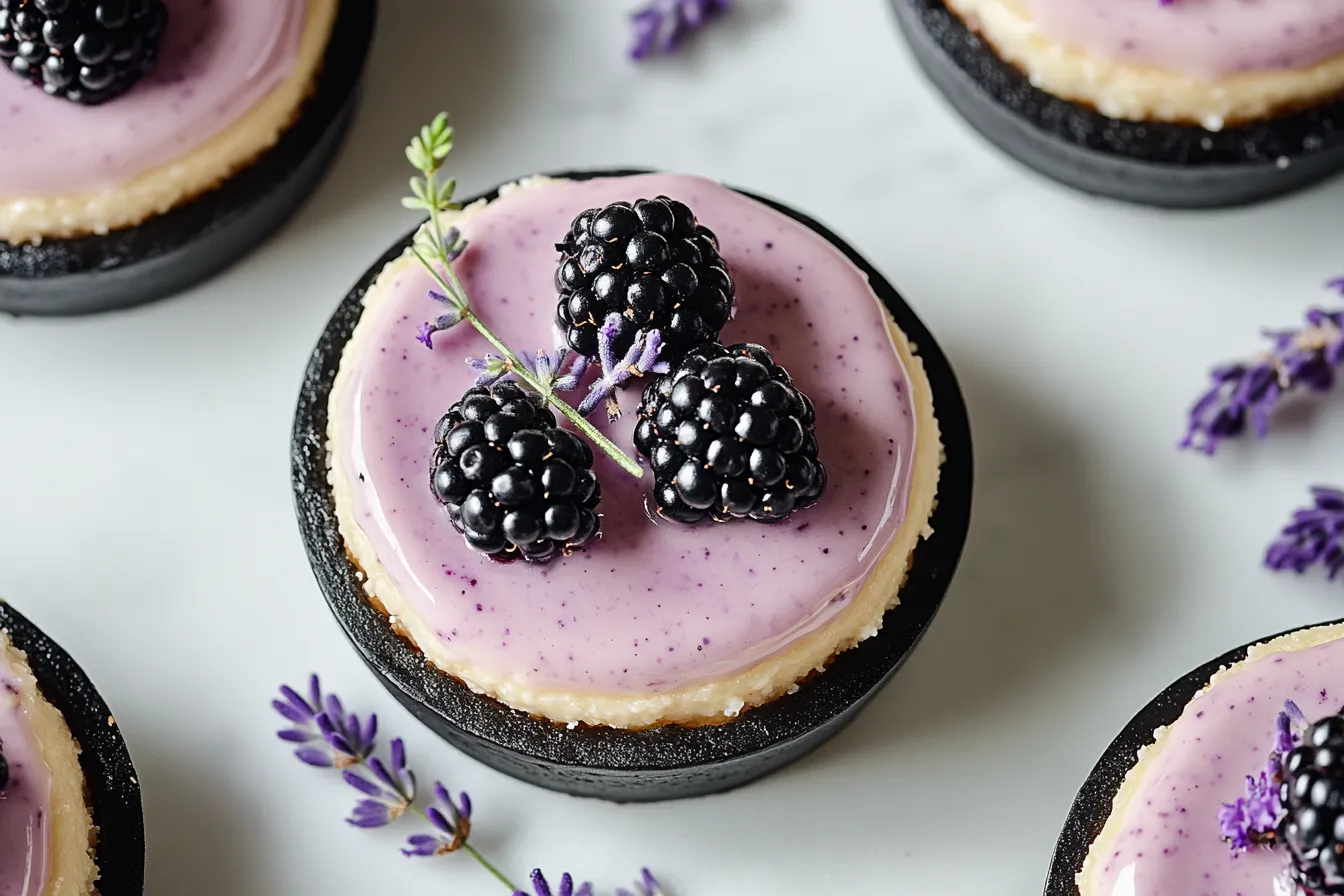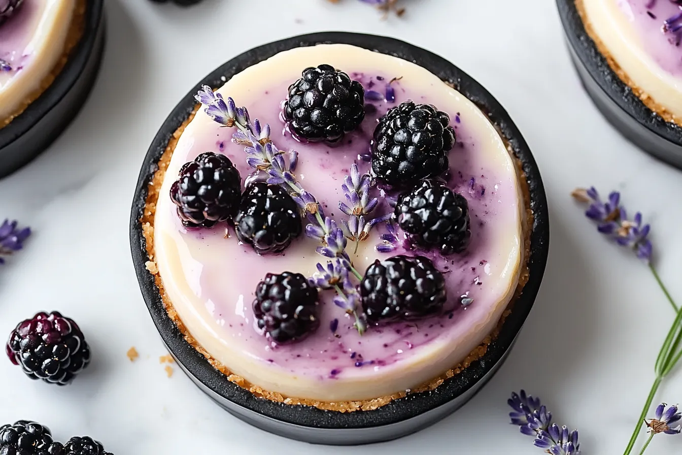 STEP 21: Serve the cheesecakes chilled, garnished with fresh blackberries or additional lavender buds if desired.