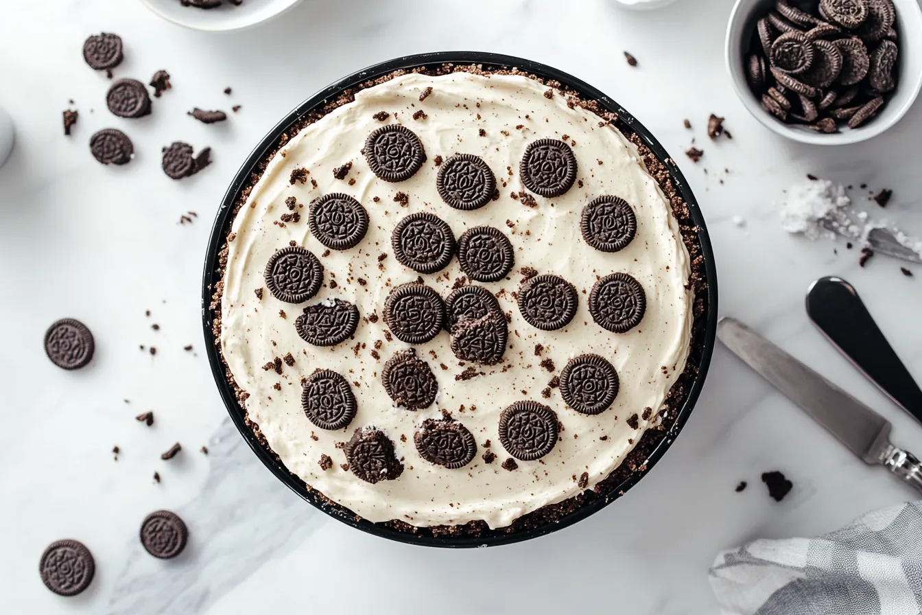- Step 9: Before serving, top the cheesecake with 8-10 whole Oreo cookies. You can either place them whole on top or break them into smaller pieces for a decorative touch.