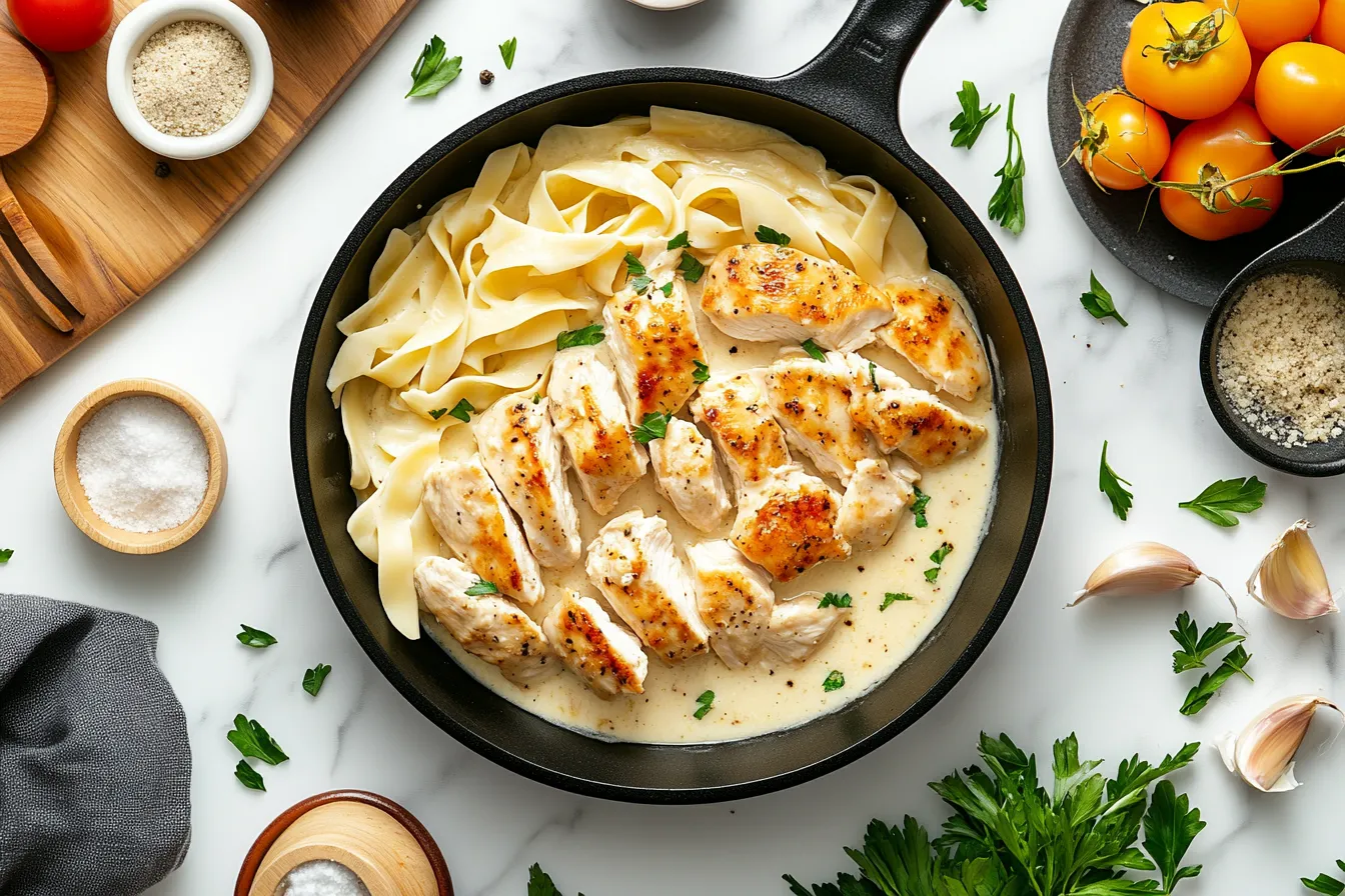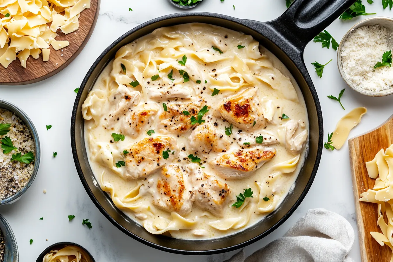 As the creamy sauce gently thickens, the rich aroma of garlic, butter, and Parmesan fills the air, instantly making you feel right at home. The chicken, perfectly tender and juicy, blends beautifully with the pasta, each bite delivering that satisfying, comforting taste we all crave. What I love about this dish is how everything comes together in one pot, no fuss, no mess. You don’t have to worry about cooking the pasta separately or making a sauce in a different pan – it all happens right there in the same pot, absorbing all those flavorful juices.