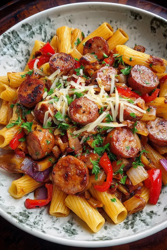 Unites smoky, tangy, and sweet notes, coating the sausage and pasta in a luscious glaze.