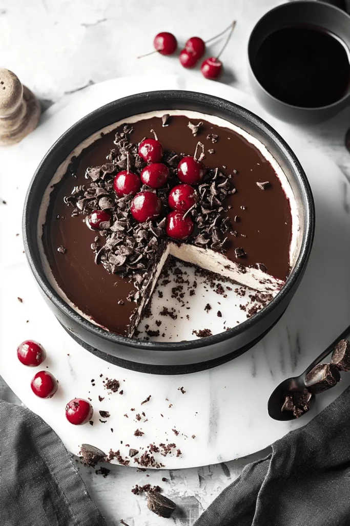 Garnish your plate with ripe raspberries or strawberries and a sprig of fresh mint. The bright fruitiness and herbaceous touch balance the cake’s richness.