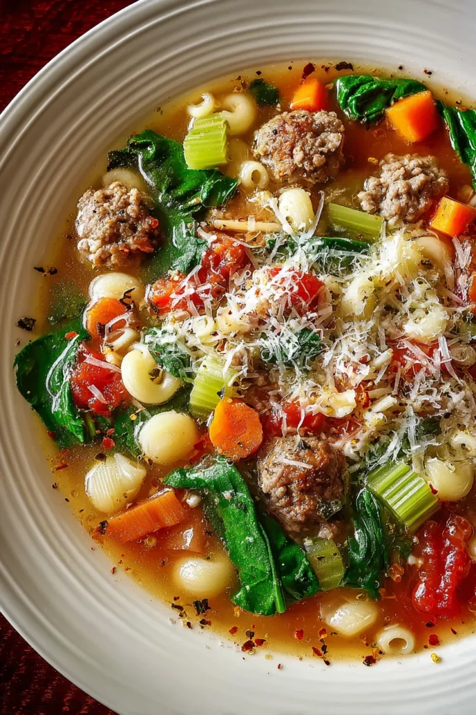 This rich and hearty soup combines Italian sausage, fresh spinach, and tender pasta in a savory broth, all finished with a sprinkle of Parmesan for irresistible flavor.
