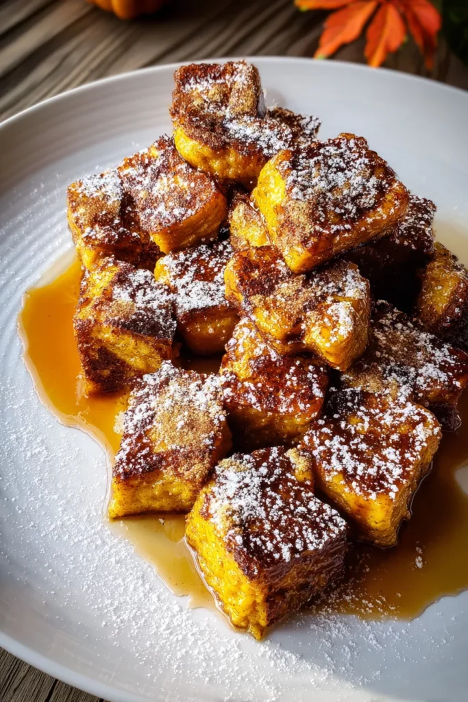 Serve the pumpkin French toast bites warm, drizzled with maple syrup and a dusting of powdered sugar.