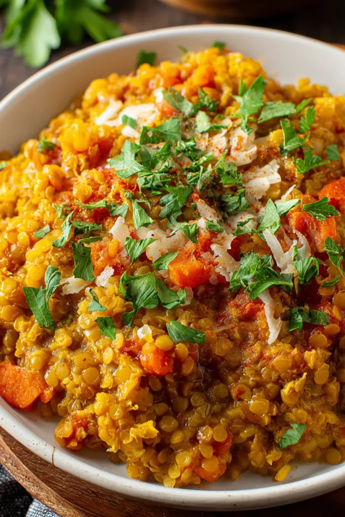 What makes this recipe shine is its simplicity and versatility. It starts with sautéed onions and garlic, developing that golden-buttery base before carrots add a sweet crunch. When the spices hit the pan, they release a fragrant embrace that sweeps through the entire kitchen—and into every forkful. The red lentils and rice absorb the savory vegetable broth until they’re meltingly soft, while diced tomatoes lend just the right amount of acidity. As a finish, a handful of parsley and a sprinkle of Parmesan cheese add bright, savory notes that elevate each bite. You’re not just cooking a meal—you’re crafting a cozy moment that lingers long after the last morsel is gone.
