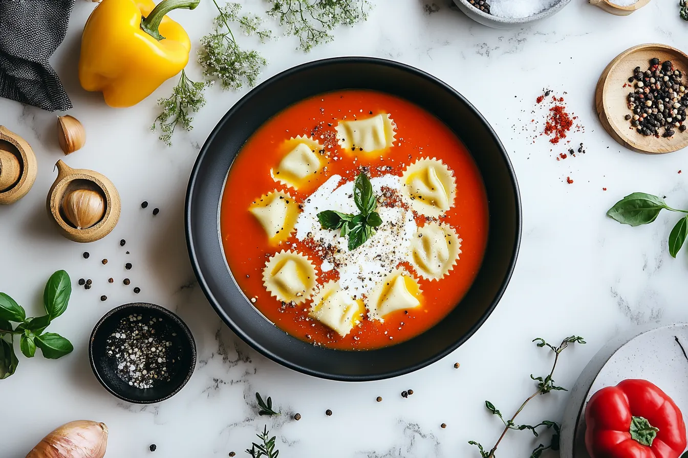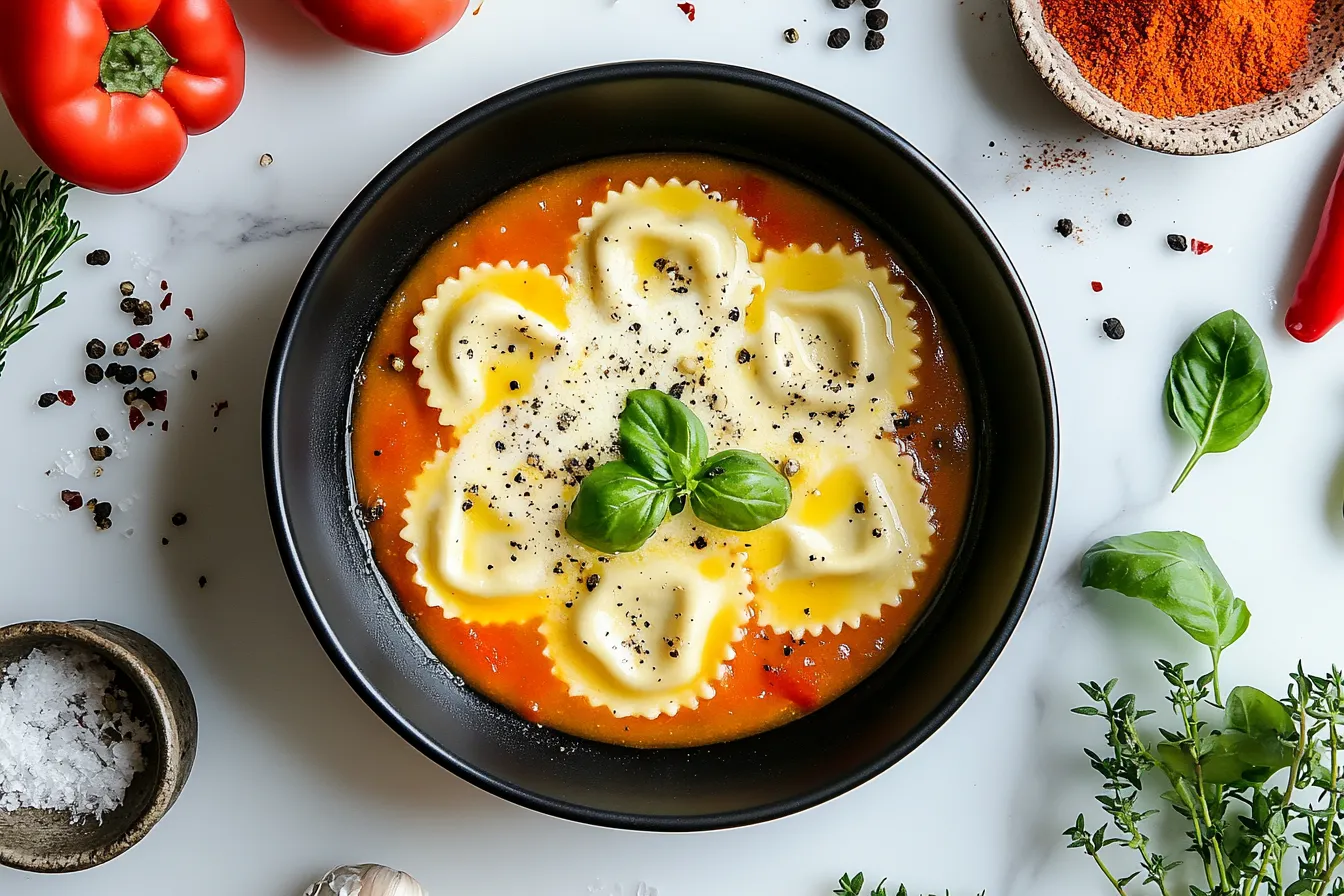 A comforting bowl of savory roasted red pepper ravioli swimming in a rich, velvety tomato broth. Each bite bursts with sweet, smoky pepper flavor wrapped in tender pasta, creating the perfect balance of warmth and satisfaction.