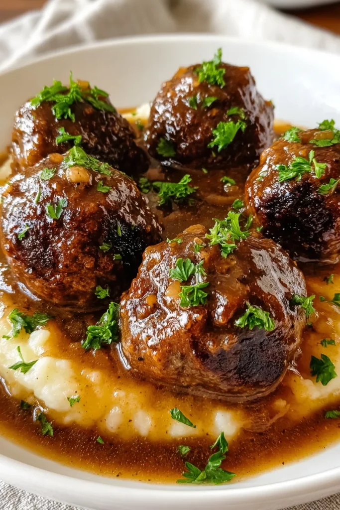 These tender Salisbury steak meatballs are simmered to perfection in a rich, savory sauce, delivering mouthwatering flavors that bring everyone to the table.