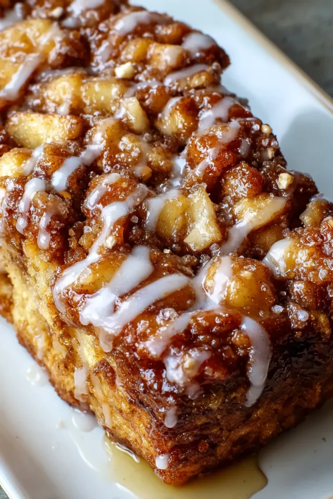 Experience the cozy flavors of autumn in every slice of this spiced apple fritter bread, filled with tender apple chunks and topped with a sweet glaze.