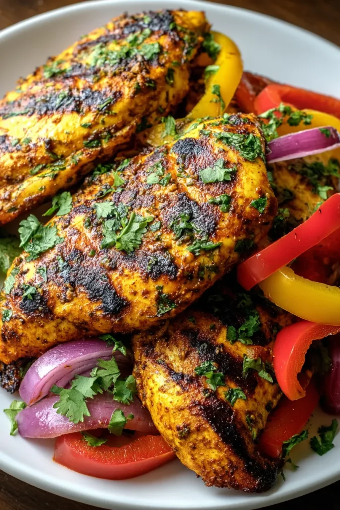 Get ready to dive into a vibrant medley of flavors with this Spicy Mexican Grilled Fiesta Chicken! Each juicy, lean chicken breast is lovingly coated in a zesty marinade that brings together smoky chili powder, earthy cumin, tangy lime juice, and a hint of fiery cayenne. As you spoon that bright, aromatic mixture over the meat, you can almost taste how it seeps into every crevice, promising layers of bold, mouth-puckering goodness. When those seasoned breasts hit the hot grill, they sear to a perfect char, locking in all the spice and moisture while creating those coveted grill marks that scream summer. Toss alongside a mix of red and yellow bell peppers and sweet red onions, and you’ll discover how their natural sugars caramelize under the heat, offsetting the heat of the chili spices. A shower of fresh cilantro at the very end adds a cool, herbal pop, balancing each bite so that every mouthful feels like a joyful Mexican street party on a plate.