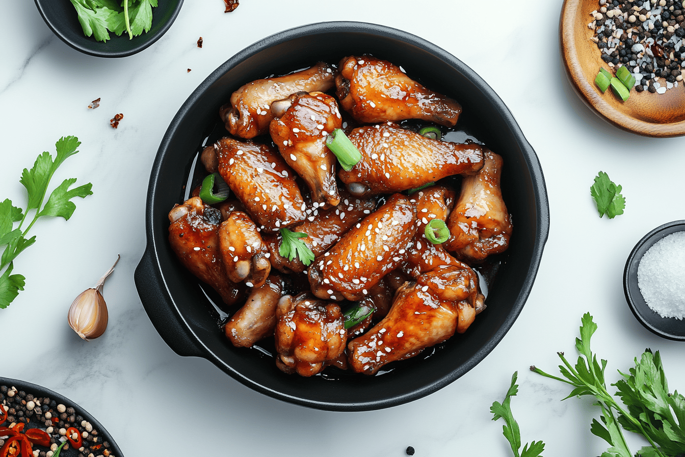 Sprinkle sesame seeds and sliced green onions over the wings for garnish.