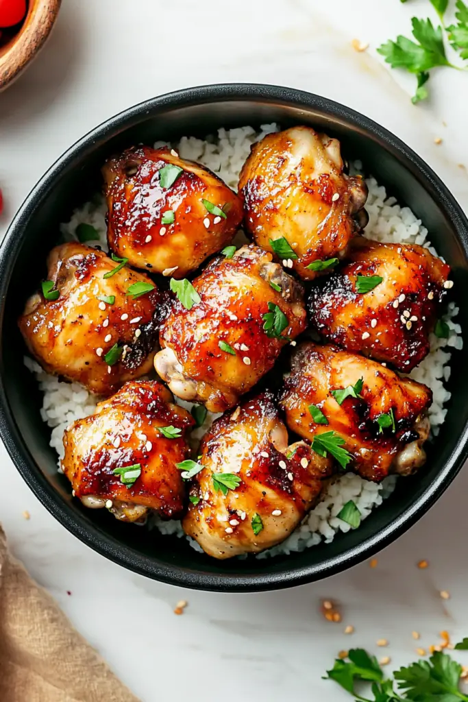 - Feel free to garnish the cooked chicken thighs with sesame seeds, chopped green onions, or cilantro for added flavor and presentation.