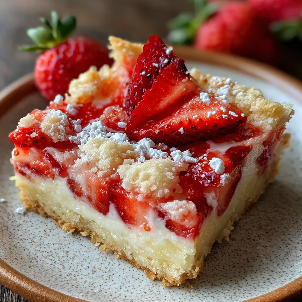 Buttery crumbs bake golden and crisp, then give way to juicy strawberry filling that bubbles up in the oven. After chilling, each bar holds a sweet-tart burst of summer fruit in every forkful.