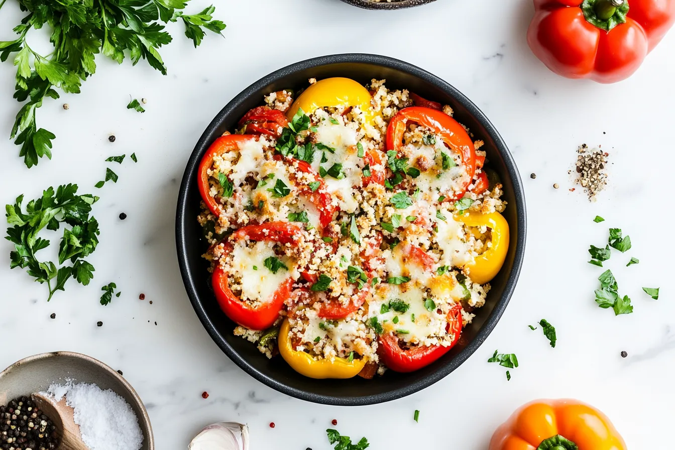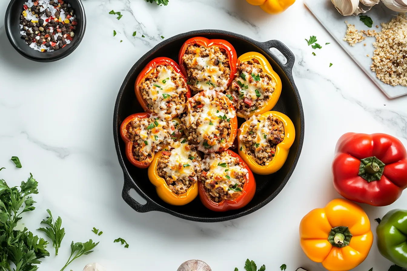 Sweet, colorful bell peppers packed with savory rice, tender ground meat, and melted cheese—each bite bursts with a harmonious blend of smoky, zesty, and earthy flavors. A comforting, satisfying dish that feels like a warm hug on a plate!