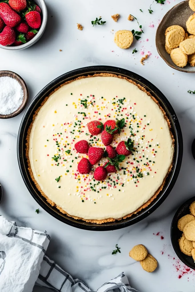 - STEP 7: Before serving, top the cheesecake with your choice of fresh berries, whipped cream, or a light dusting of powdered sugar for a beautiful finishing touch. Enjoy!