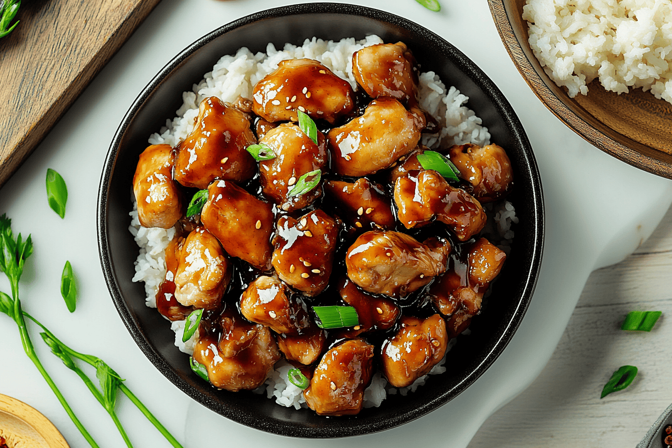 Tender chicken coated in a luscious sweet and sticky glaze that's bursting with a perfect balance of savory, tangy, and sweet flavors. Each bite is a delightful explosion of succulent juiciness and irresistible stickiness. Get ready for a flavor-packed experience that will leave you craving more!