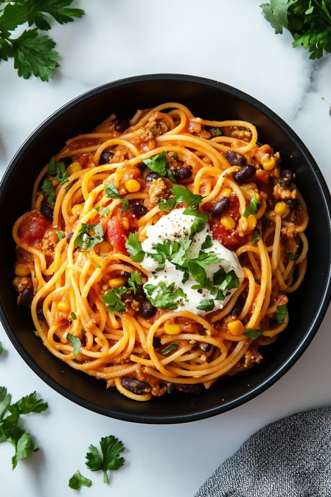 For an extra burst of flavor, serve your taco spaghetti with a spoonful of your favorite salsa and a few slices of ripe avocado. The creamy avocado adds a rich texture that balances the spiciness of the dish, while the salsa brings a fresh, tangy zing. It’s like giving your taco spaghetti a little fiesta on top!
