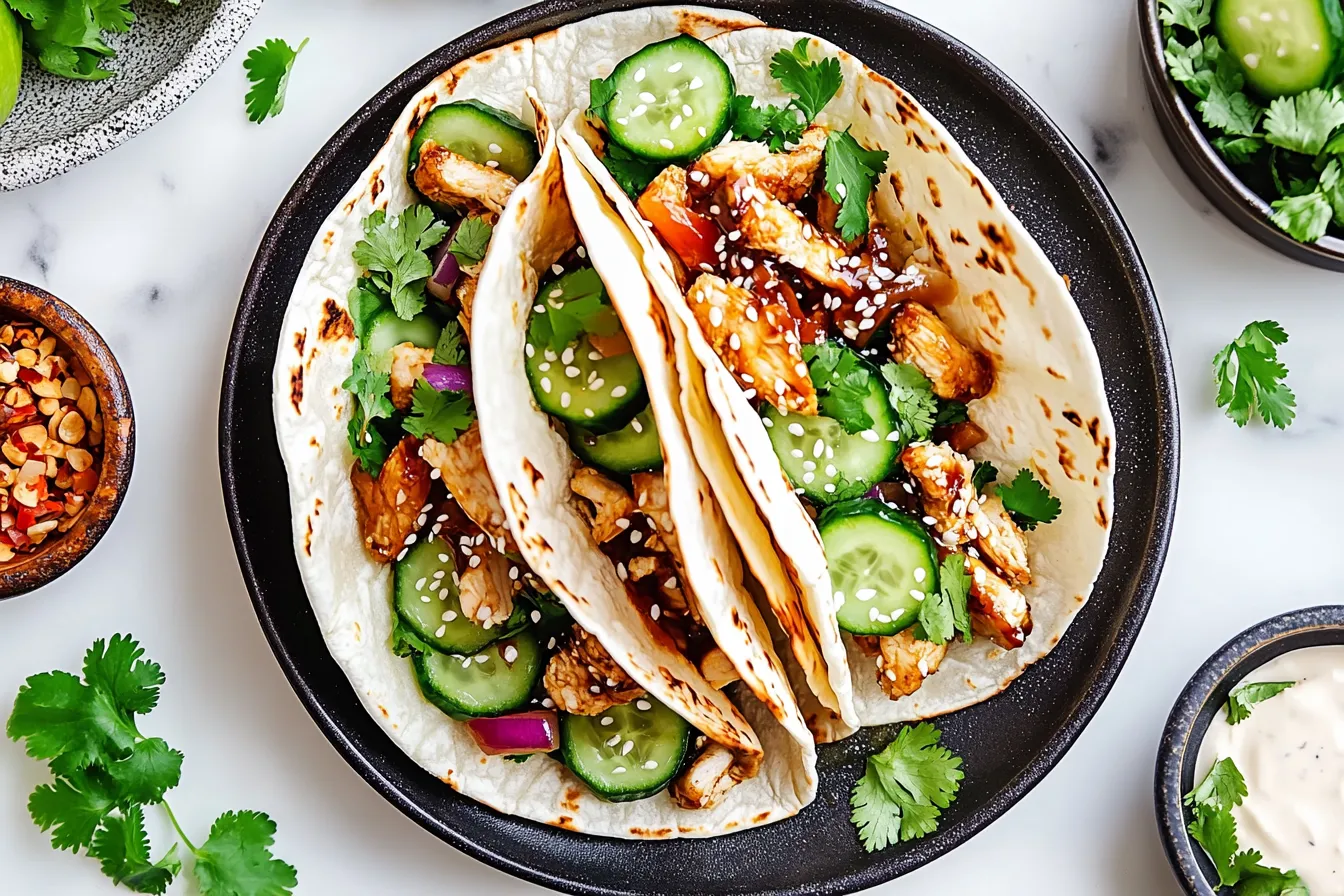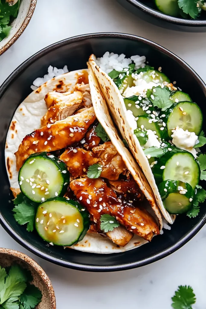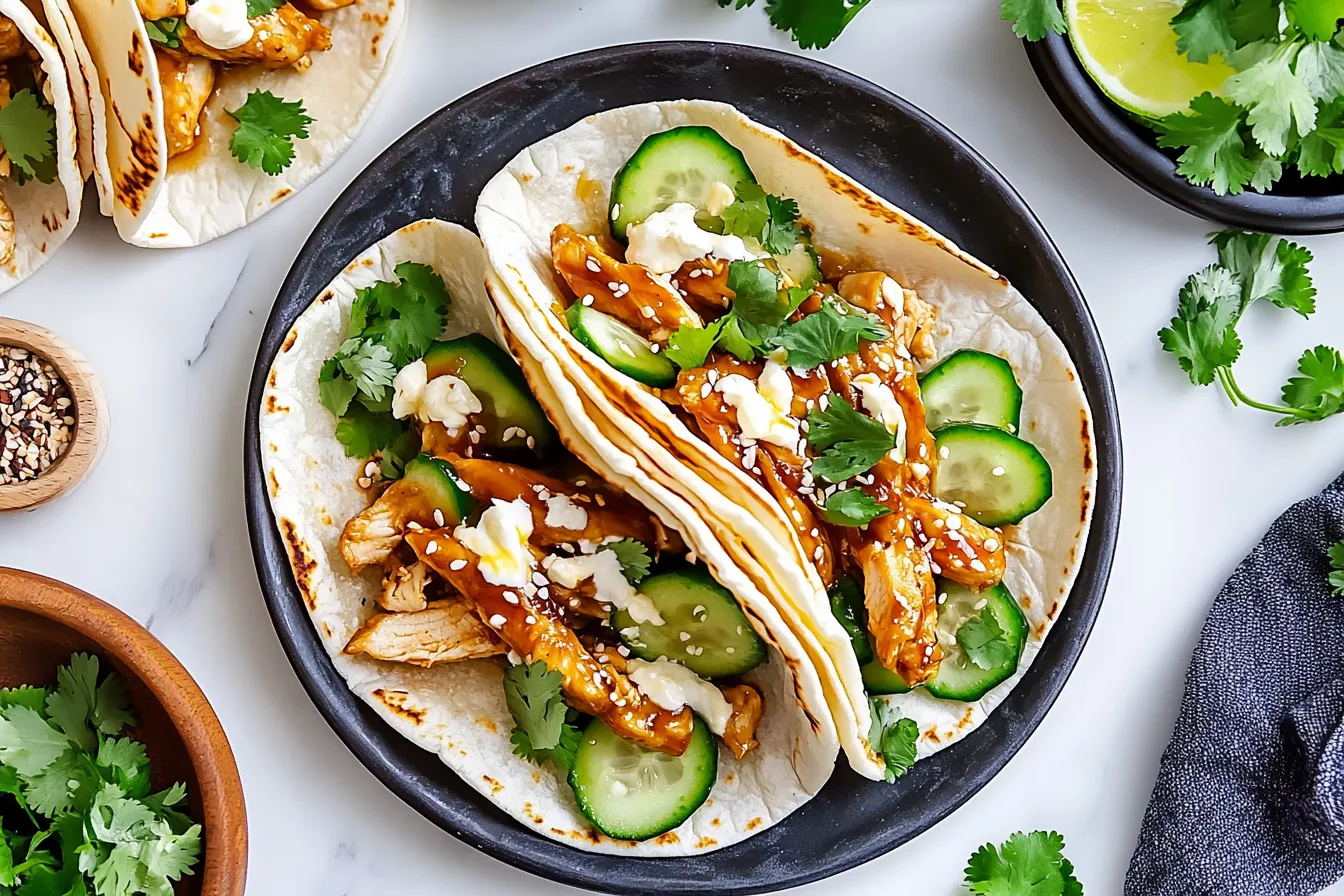 Tender teriyaki chicken nestled in soft tortillas, topped with a crunchy, creamy sesame cucumber slaw. The perfect balance of savory sweetness and refreshing crunch in every bite—an unforgettable fusion of flavors that will leave you craving more!