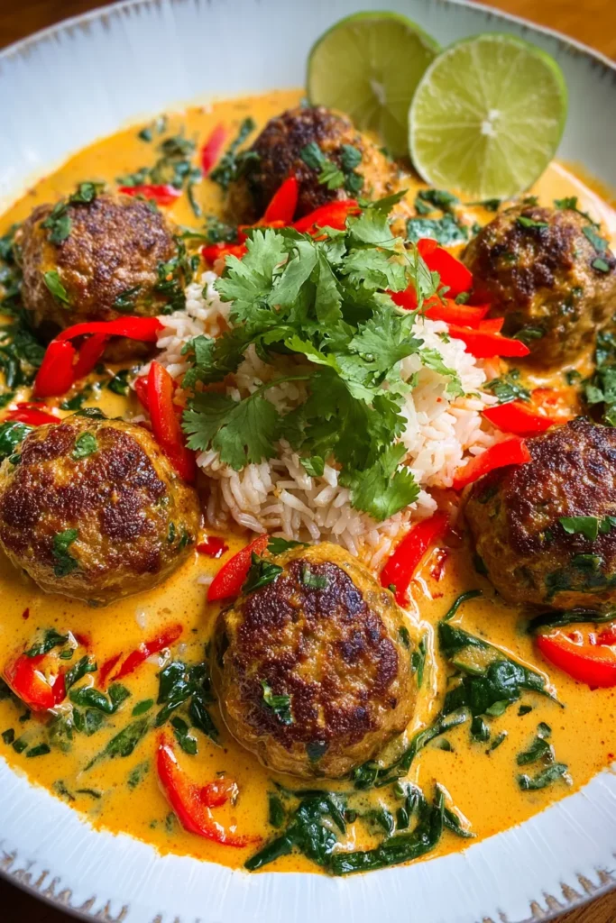 Serve the meatballs and curry sauce over cooked rice, garnished with fresh cilantro and lime wedges.