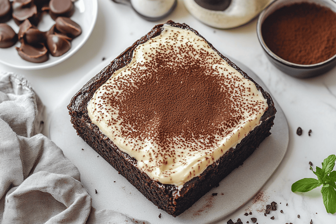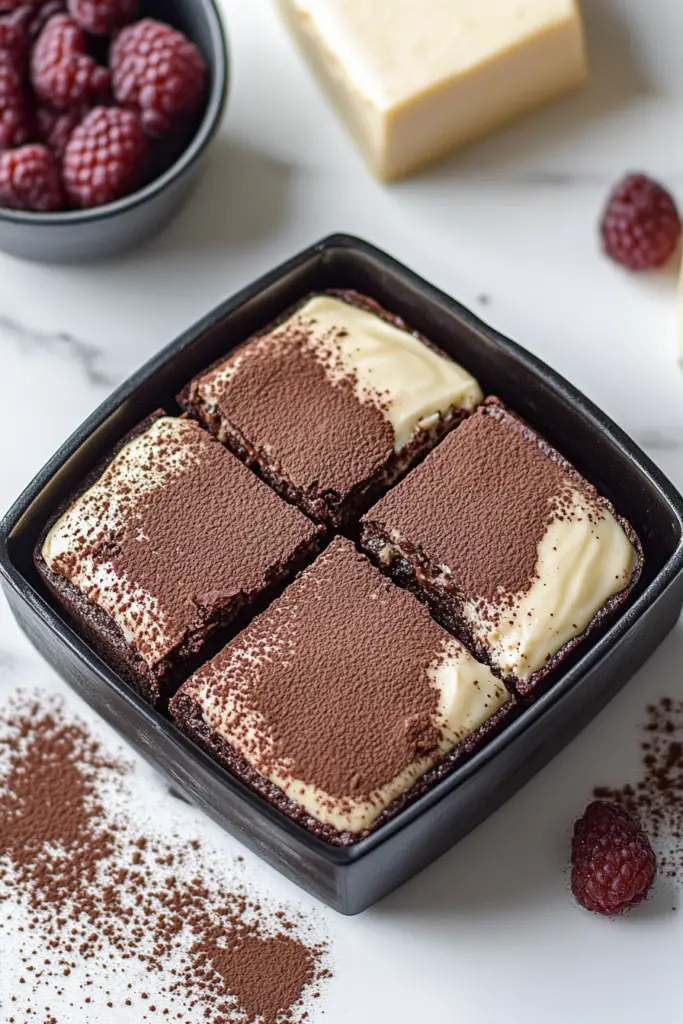 - STEP 16: Before serving, dust the top of the tiramisu brownies with cocoa powder for an elegant touch.