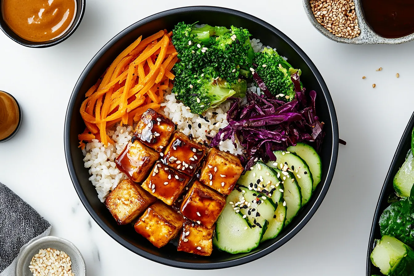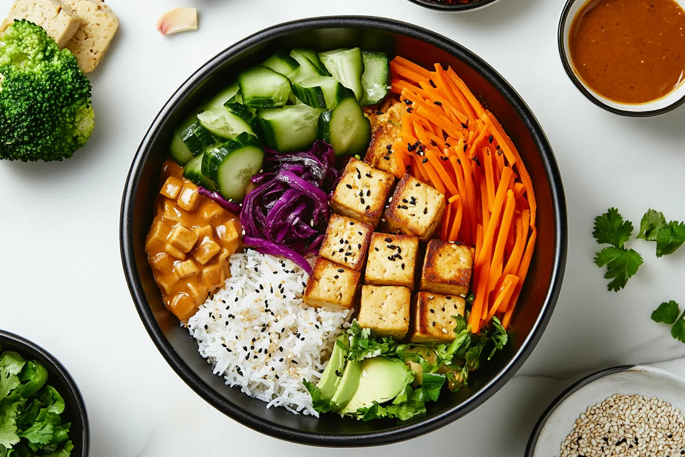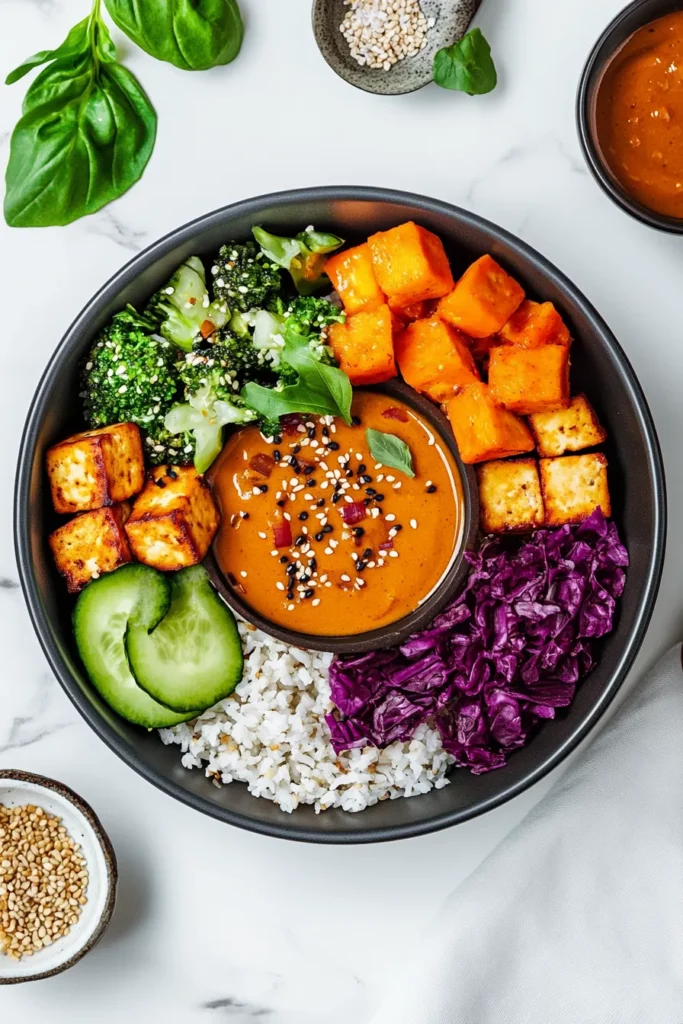 A colorful, nourishing bowl filled with crispy tofu, fresh veggies, and grains, all drizzled with a rich, creamy peanut sauce. It’s a perfect balance of savory, crunchy, and slightly sweet, offering a satisfying and wholesome bite with every spoonful.