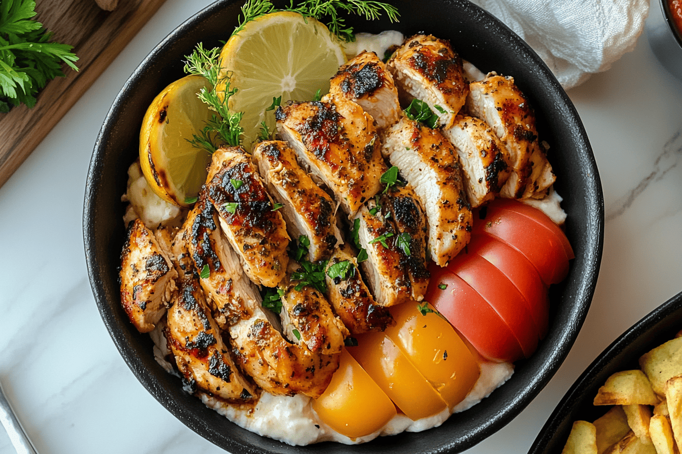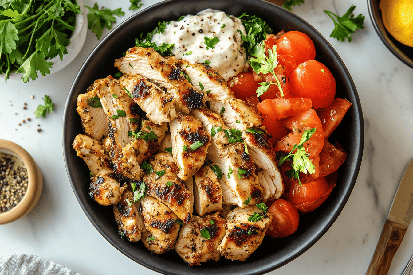 Tzatziki Sauce: Creamy and tangy, tzatziki sauce acts as a cooling and refreshing condiment, complementing the savory chicken with its yogurt, cucumber, dill, and garlic flavors.