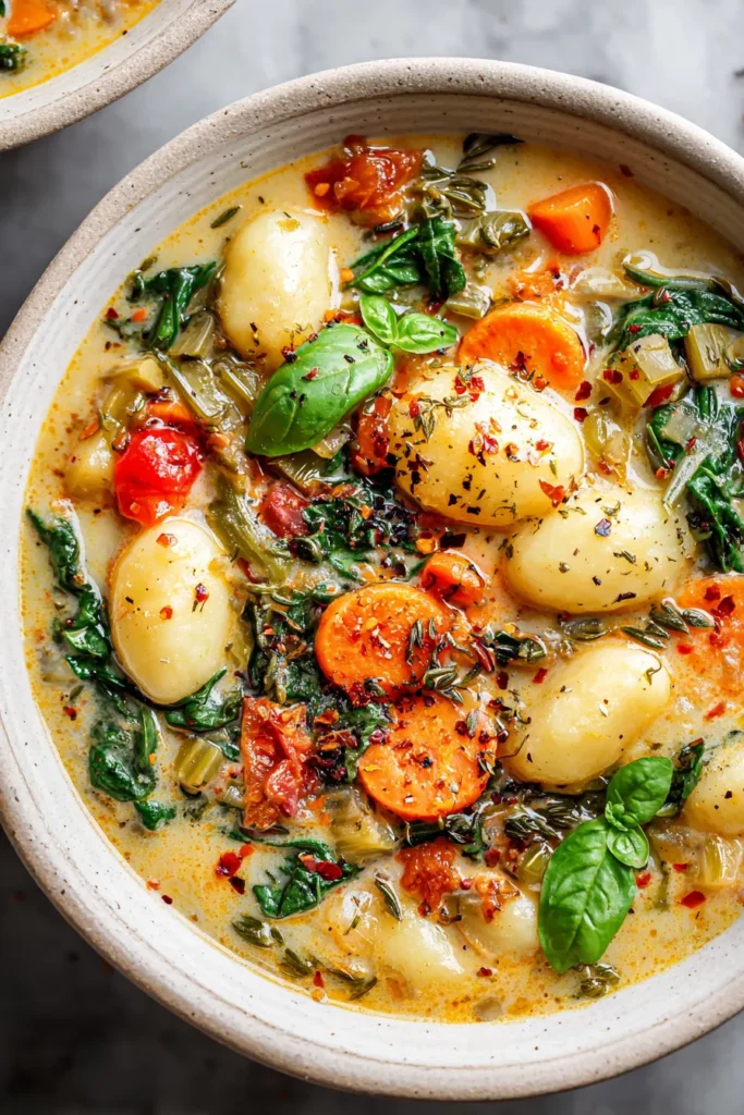 Experience a bowl of joy with this Tuscan Vegan Gnocchi Soup featuring vibrant veggies, creamy coconut milk, and tender gnocchi. Perfectly spiced and soothing!