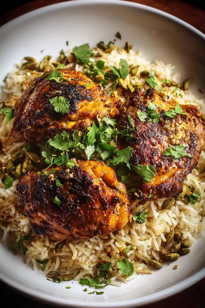 11. Slice the thighs into strips or bite-sized pieces. To serve, spoon a generous portion of cardamom-spiced rice onto each plate and top with the sliced Vadouvan chicken. Garnish with fresh cilantro for a burst of color and herbaceous brightness.
