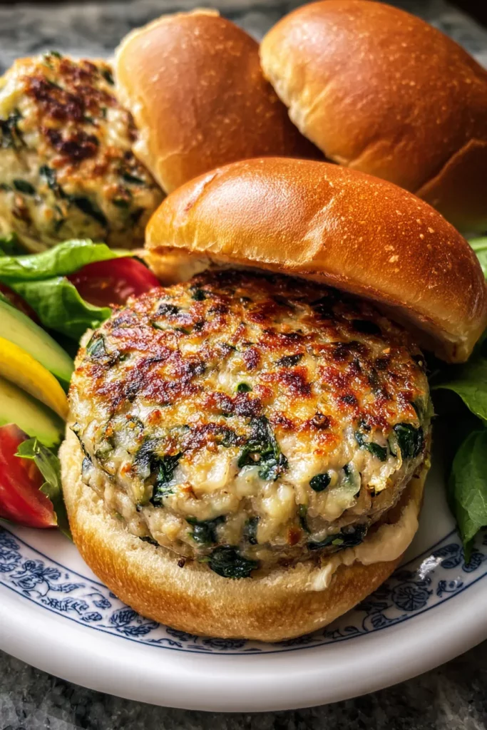 These White Cheddar Spinach Chicken Burgers offer a savory blend of tender chicken, sharp cheddar, and fresh spinach, delivering a mouthwatering experience with every bite.