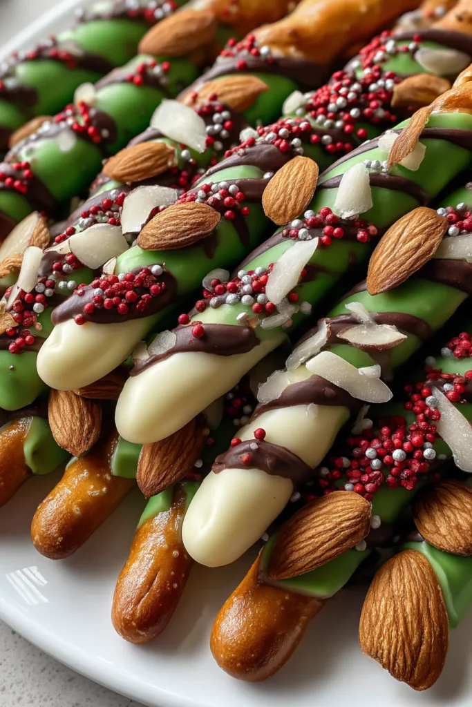 Dip each pretzel rod into the green chocolate, covering about two-thirds of the rod. Allow excess chocolate to drip off before placing it on the prepared baking sheet.